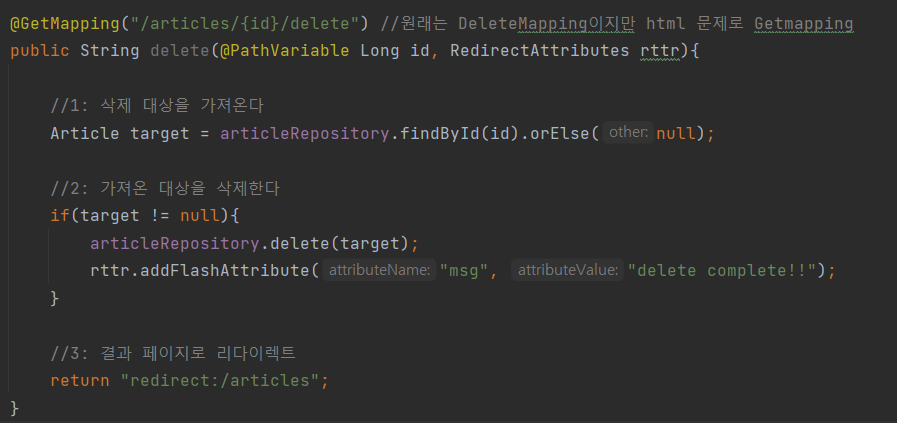 원래 게시물을 삭제해야 하므로 @DeleteMapping을 사용해야 하는데 삭제 기능이 제공되지 않아 @Getmapping을 사용하였다.