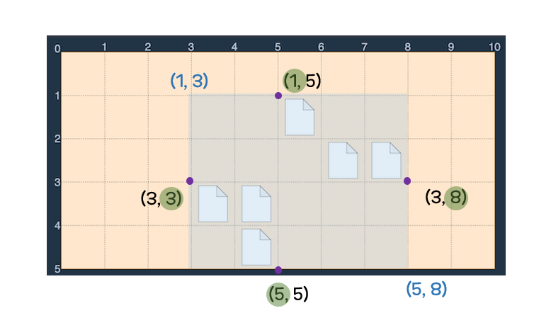 - 예제 #2의 바탕 화면은 다음과 같습니다. (1, 3)에서 (5, 8)로 드래그하면 모든 파일을 선택할 수 있으며 더 작은 드래그 거리로 모든 파일을 선택할 수 있는 방법이 없습니다. 따라서 가장 적은 드래그로 모든 파일을 선택하는 방법인 (1, 3, 5, 8)을 반환합니다.