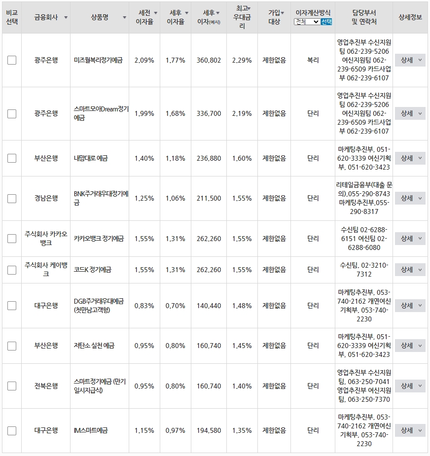 은행명 상품명 기본금리 우대금리 스탠다드차타드 e-그린세이브 5.00%0.10% 우리WON플러스 4.98%-BNK부산더(The) 특판정기 4.95%0.45% SH수협헤이(Hey)정기 4.80%-IBK기업 일석이조통장(정기예금) 4.73%-NH농협 NH왈츠회전예금 II 4.70% 0.10% 전북은행 JB다이렉트예금통장 4.60%-K정기 4.60%-광주은행 스마트 58% Dream