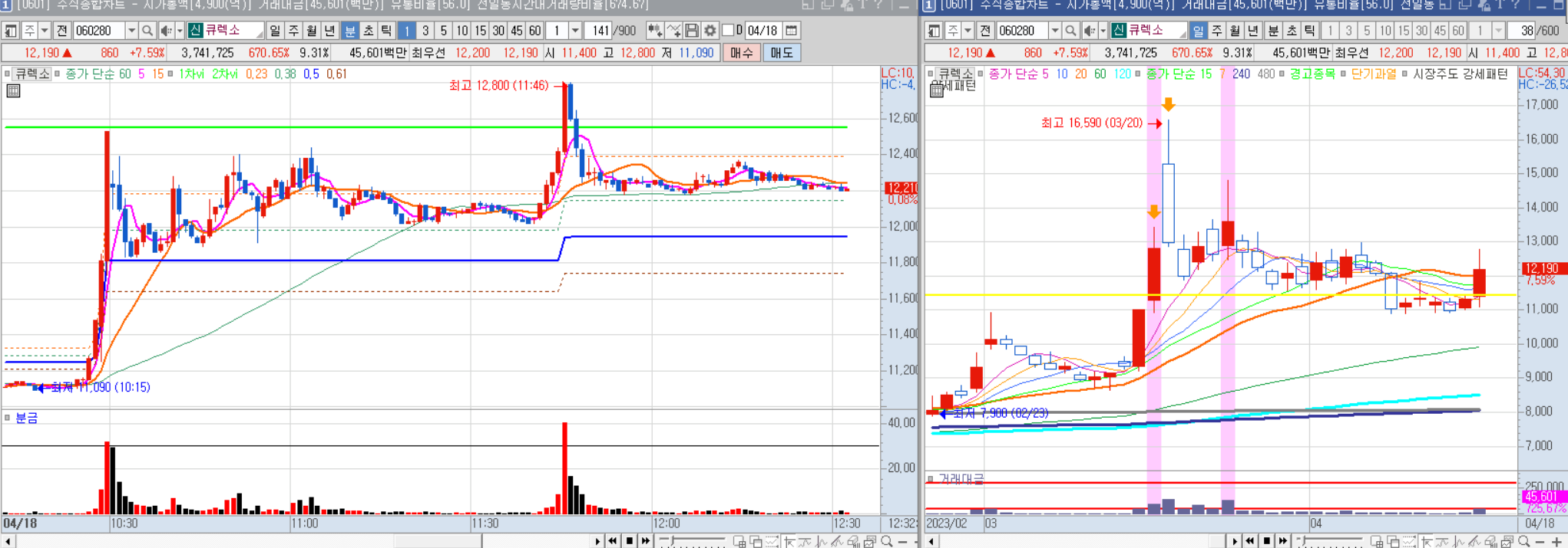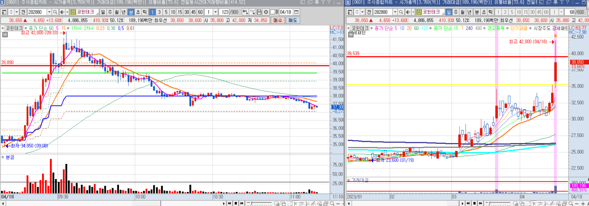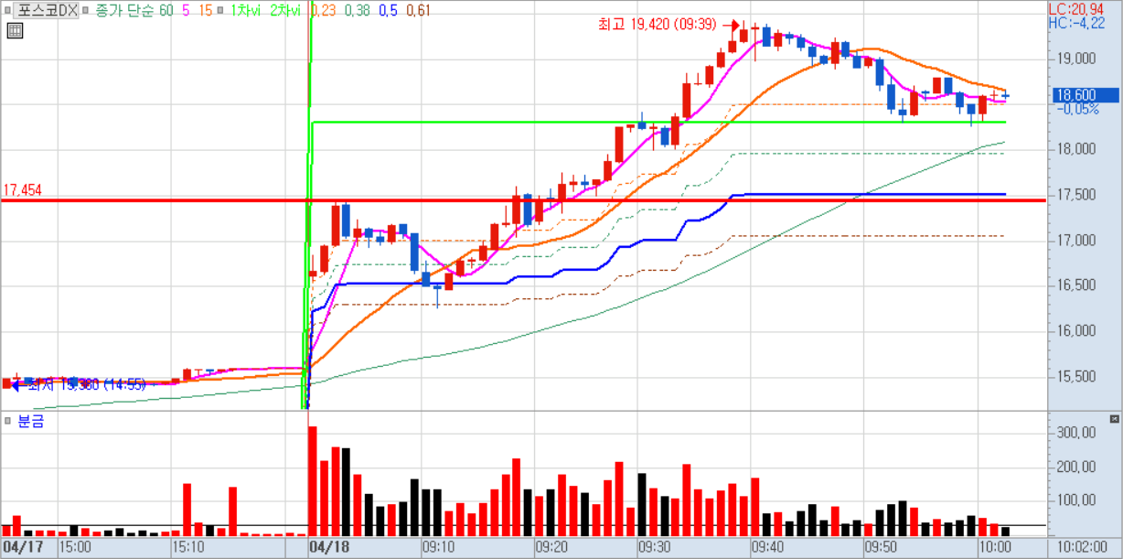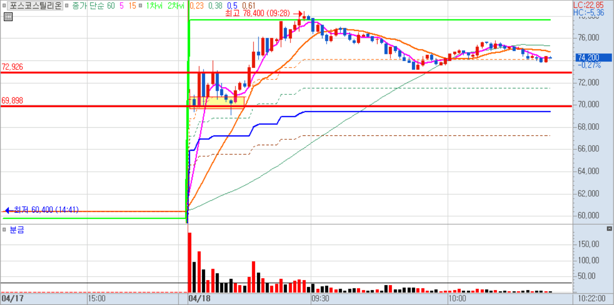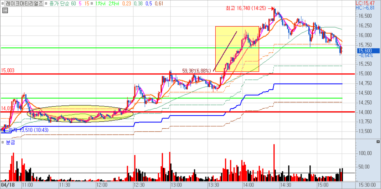 장 초반에는 갭을 두고 밀렸지만 60만원을 돌파하지 못하고 낮에는 횡보한 뒤 오후 들어 급등했다.
