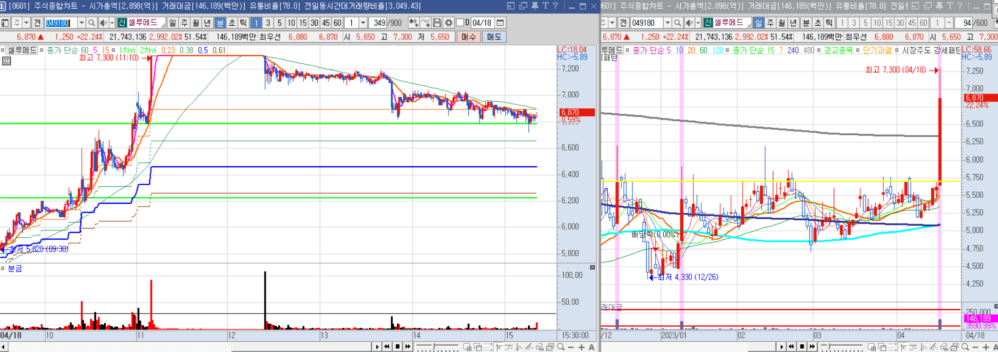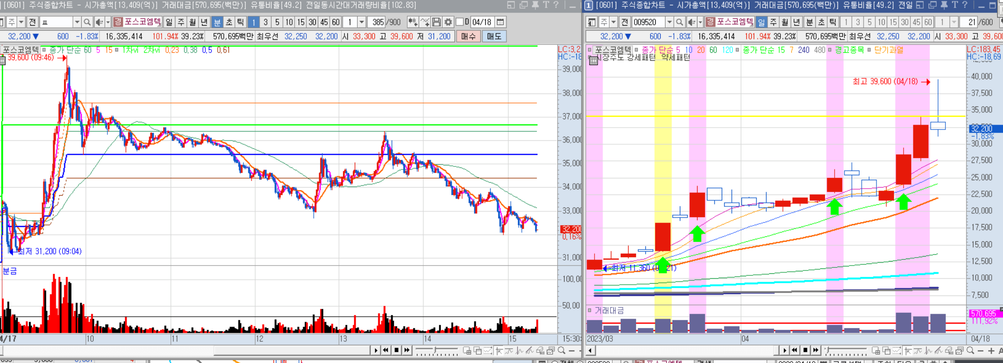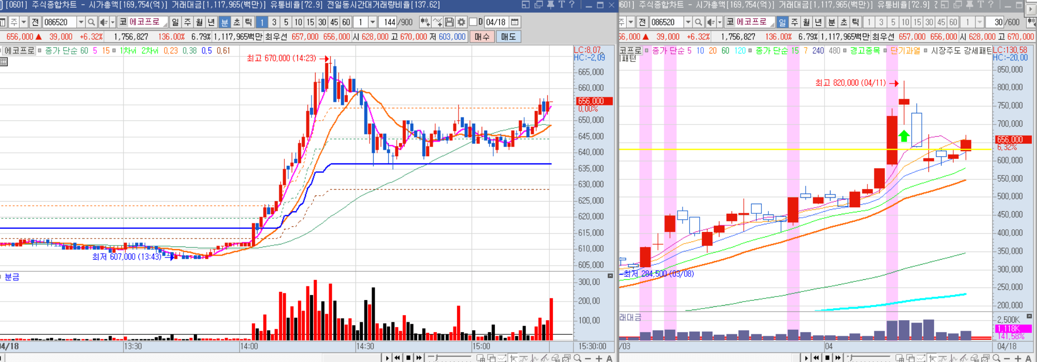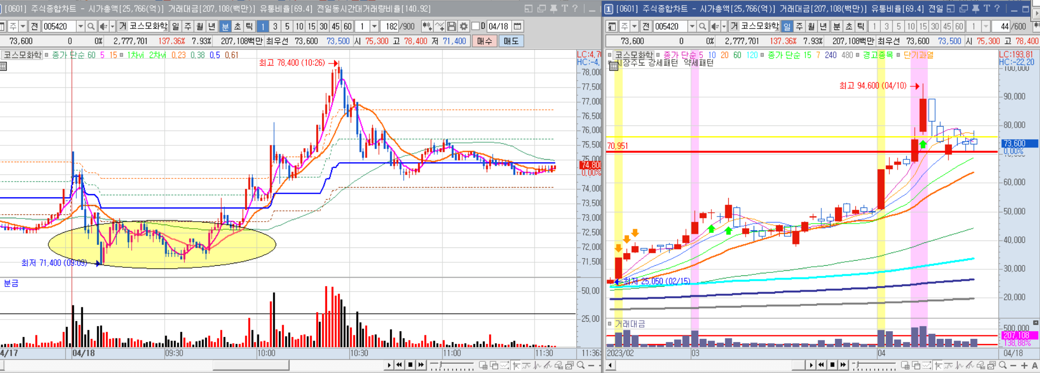 장 초반에는 갭을 두고 밀렸지만 60만원을 돌파하지 못하고 낮에는 횡보한 뒤 오후 들어 급등했다.