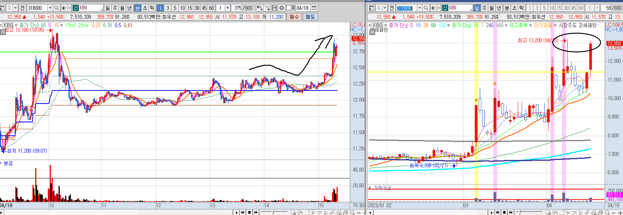 종전 최고가 14,000원 돌파 후 매도 억제