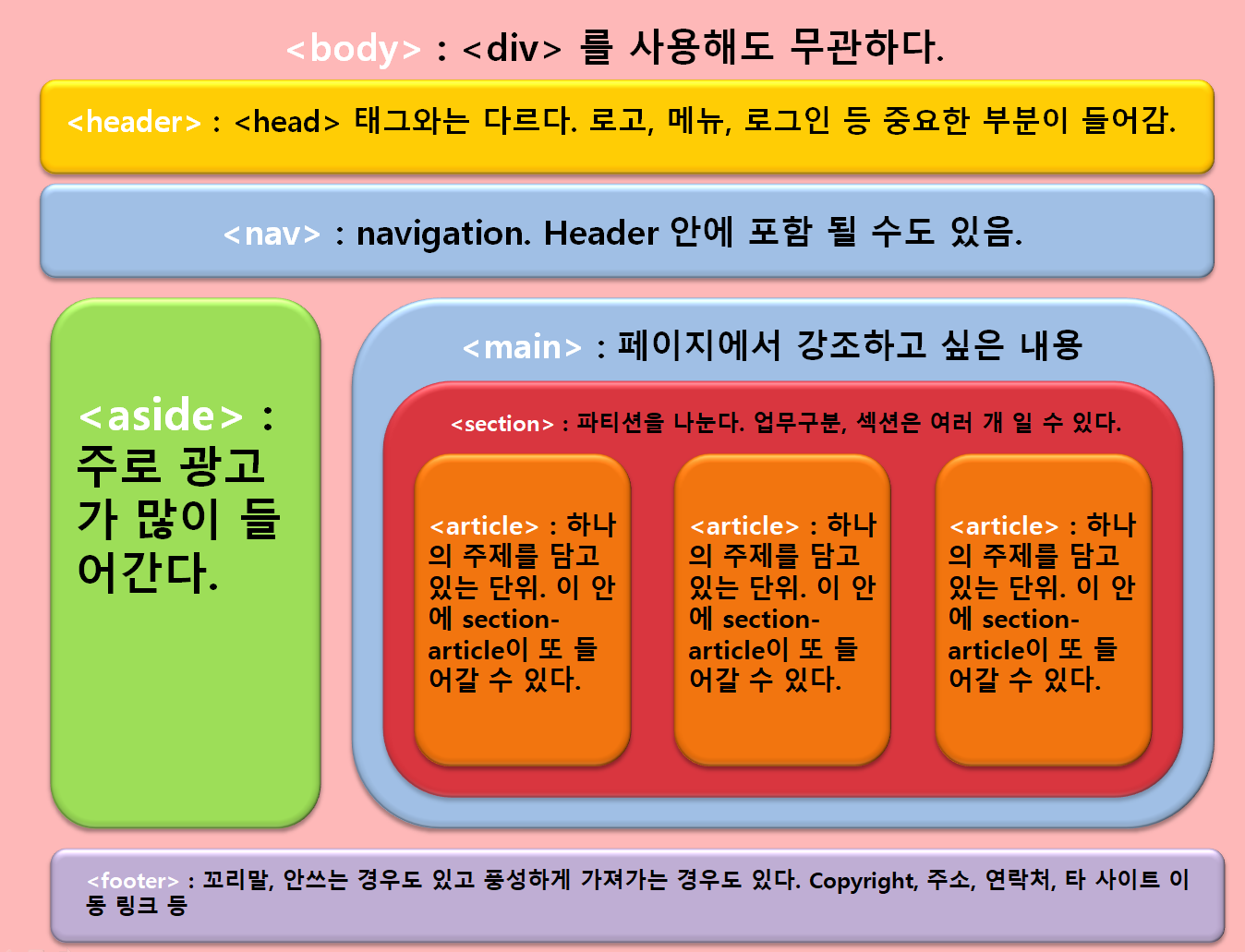 DIV 태그 VS SPAN 태그/시맨틱 태그 2023년 03월 12일 by issue 쉬운 목차 Toggle DIV 징후 긴장에 맞서 징후시맨틱 태그(시멘틱 태그)시맨틱 태그(시멘틱 태그)거의★시맨틱 태그(시멘틱 태그)장점★ DIV 징후 긴장에 맞서 징후 태그는 영역을 블록 요소로 나누고 여러 가지 방법으로 사용할 수 있습니다.. -인라인 요소의 태그 '추천 관련글, 선스크린 #1 2023 리뷰, 선스크린 블루 리자드 뉴트로지나2023년 공시단가 변동에 대해 알아보세요.양배추의 10가지 건강상의 이점영국 팝아트의 서베이, DDP 데이비드 호크니 전시 정보 ~처럼 다양한특성만 다를 뿐 같은 것이라고 생각하시면 됩니다. 인라인 요소만 래핑할 수 있습니다.. ~이다 포장도 가능. 모든 태그 랩핑 뿐만 아니라. → 시맨틱 태그 생성 시맨틱 태그(시멘틱 태그) 태그의 기능과 마찬가지로 block 속성은(블록 요소)그리고 사이트 구조(공들여 나열한 것공들여 나열한 것)디자인하는 날이다. HTML이 태그는 웹사이트의 구조를 디자인할 때 태그에 의미를 부여하여 웹사이트의 구조를 더 잘 이해하기 위해 만들어졌습니다.. 시맨틱 태그(시멘틱 태그)거의 : 헤더, 제목 : 항해, 항해, 색인, 주로 목록처럼 다른 페이지로 점프하기 위한 링크 공간으로 표현된다.. :왼쪽과 오른쪽 위치의 공간을 나타냅니다., 본문 외에 부수적인 내용을 주로 표현. : 주제별, 태그를 사용하여 범주별로 구분. 동일한 주제로 여러 콘텐츠를 그룹화. : 기사, 블로그와 같은 텍스트 위주의 페이지를 만들 때 주로 사용 : 보행인, 보행인, 문서 끝 부분의 정보 구분 공간을 표현하는 태그 : 콘텐츠 작성자 또는 사이트 소유자에 대한 추가 정보가 포함된 태그입니다. 메인> : 문서 의 중심 주제, 응용 프로그램의 기본 콘텐츠 또는 핵심 기능과 직접 관련되거나 이를 확장하는 콘텐츠를 제공합니다.. : 그림, 도표, 사진과 같은 독립적인 콘텐츠를 정의할 때 사용 제목 및 관련 부제를 포함하는 태그입니다. 주변 문맥에서 강조 표시된 구절의 관련성 또는 중요성으로 인해 참조 또는 표기를 위해 강조 표시되거나 강조 표시된 텍스트를 나타냅니다.. 설명 요소 캔톤(부제) 정당성 현재 상황과 관련이 있거나 중요한 부분을 강조합니다. 특정 시점 또는 기간약속 시간다음과 같은 속성을 사용하여 알림과 같은 기능을 구현합니다. 세부 항목 요약, 레이블 또는 범례를 지정합니다.. 요약 상위 요소를 클릭하십시오. 세부 요소의 상태는 열려 있고 닫혀 있습니다.. ★시맨틱 태그(시멘틱 태그)장점★ ⑴ SEO 최적화에 좋습니다(검색 엔진 최적화) 검색 엔진은 태그의 목적과 구조가 일치하는 웹 사이트에서 정보를 더 빠르고 효율적으로 찾을 수 있으므로 검색 결과를 표시하는 데 유리합니다.. ⑵ 웹 접근성에 효율적 스크린 리더(시각장애인을 위한 웹서핑 프로그램)다음과 같은 환경에서 웹 접근성 및 사용성을 향상시킵니다.. ⑶ 손쉬운 유지 보수 많은 다양한 사용으로 인해 관리가 어려워지는 문제 없이 태그 이름만 봐도 어느 영역인지 바로 확인할 수 있습니다., 태그 영역의 속성에 맞는 작업 분류가 용이합니다..